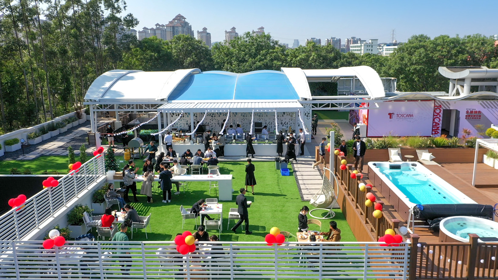 位于大楼楼顶的室外生活体验中心,融合了多个系列产品,集合花园、泳池、草坪、灯光等元素,打造真正沉浸式的如神秘花园般光影绿意的室外空间。